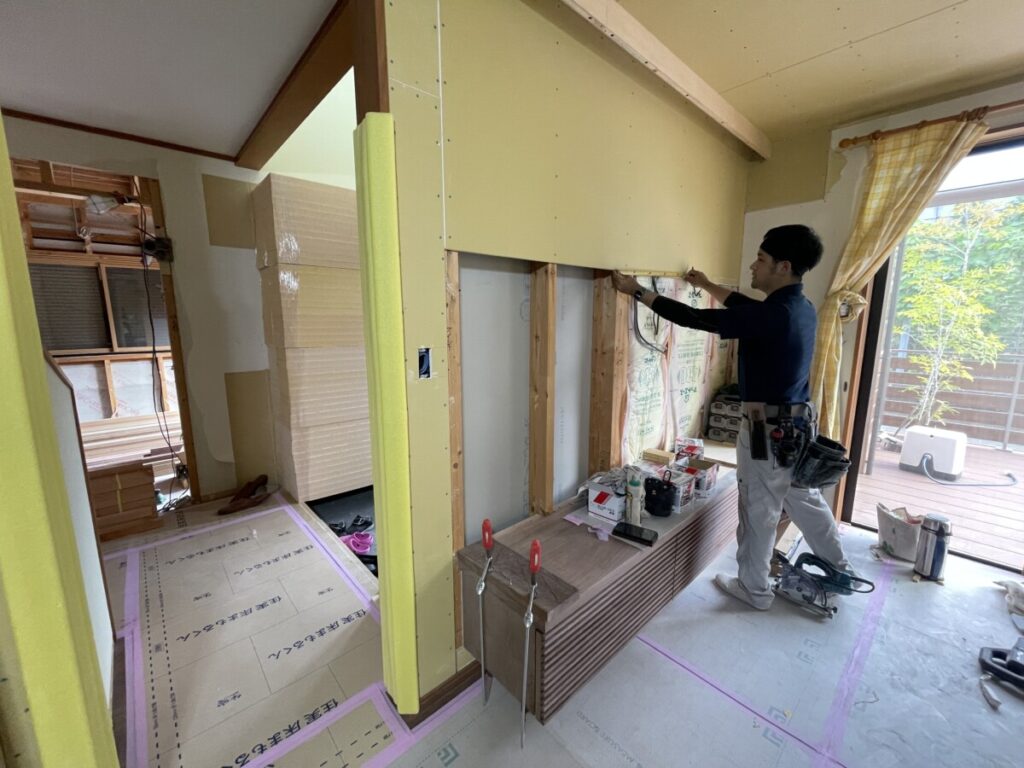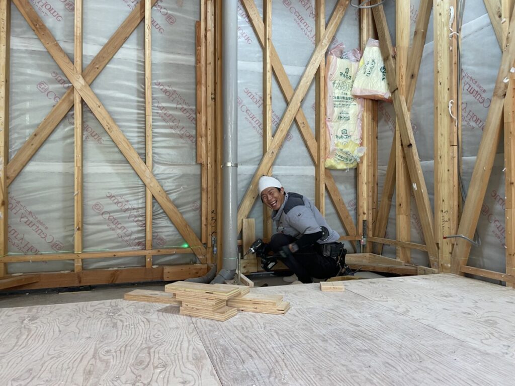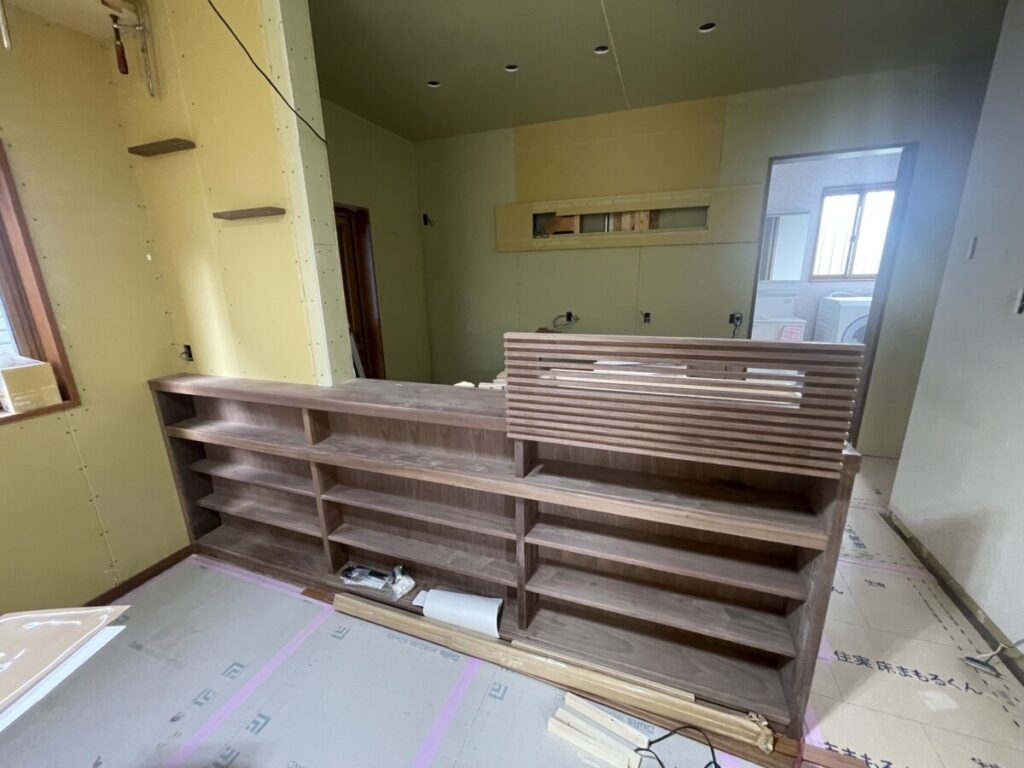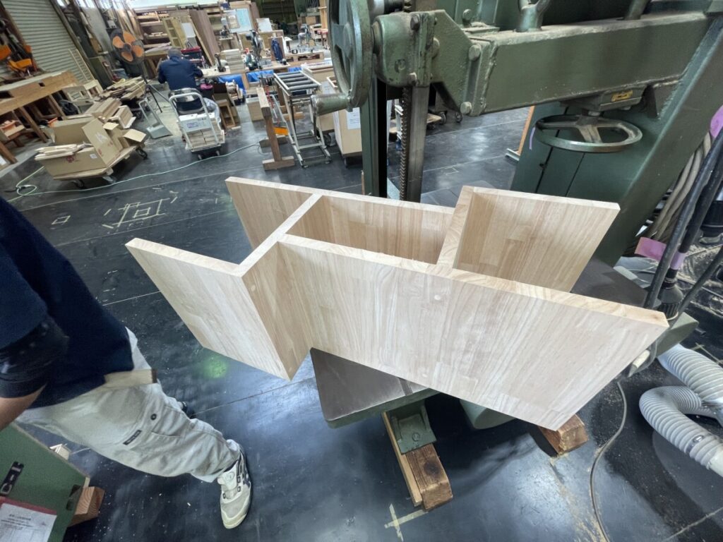 現場を西田君が進めている間に、加工場で戸塚君が家具を作っています。