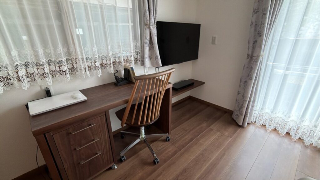 ベッドサイドの小棚まで、ウォールナットで製作しました。