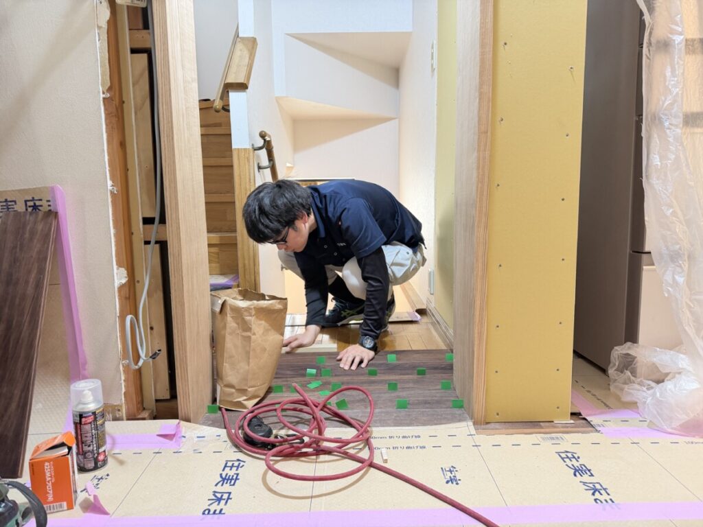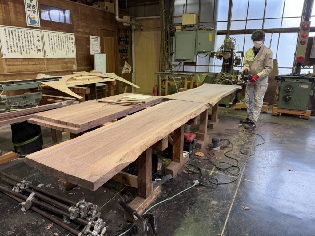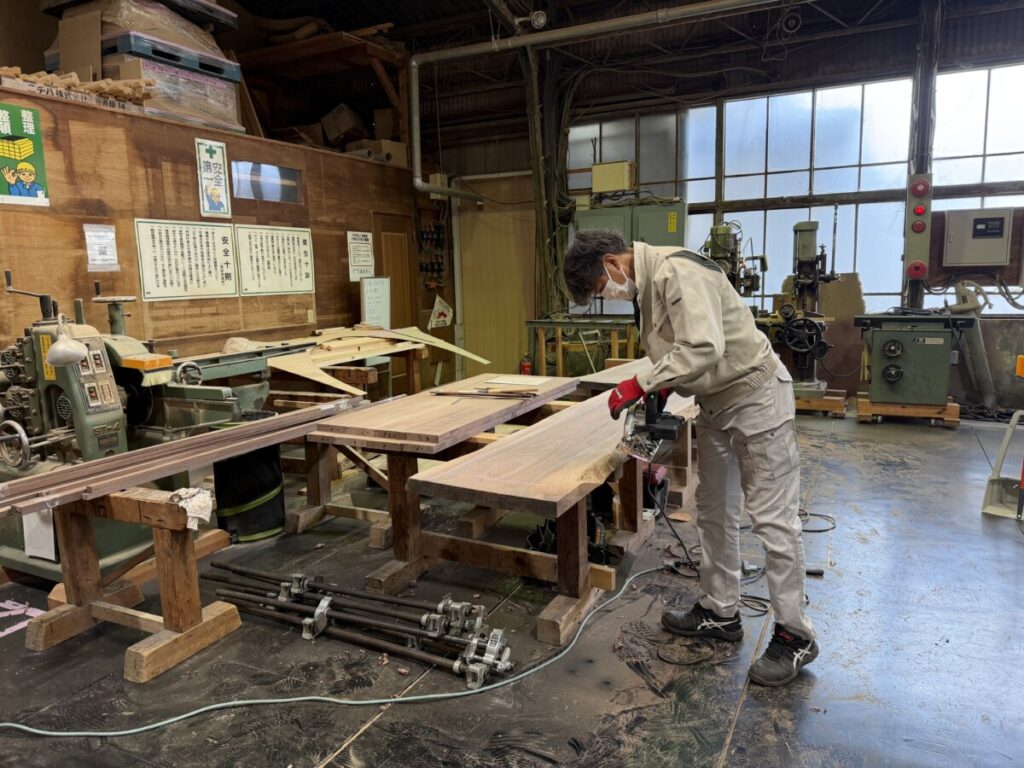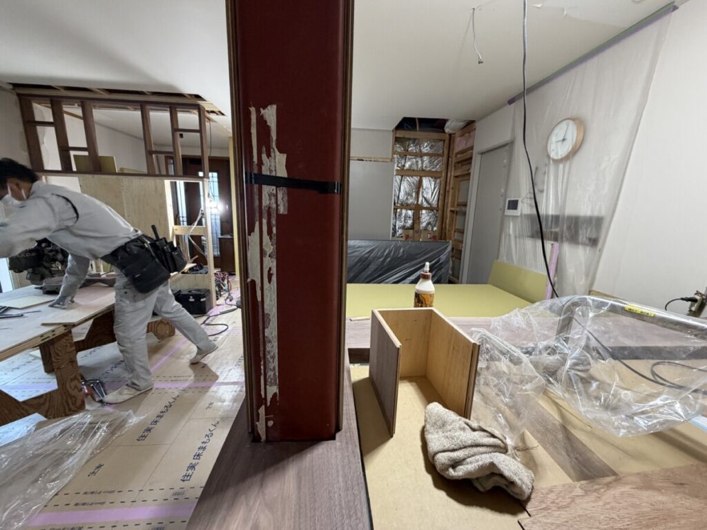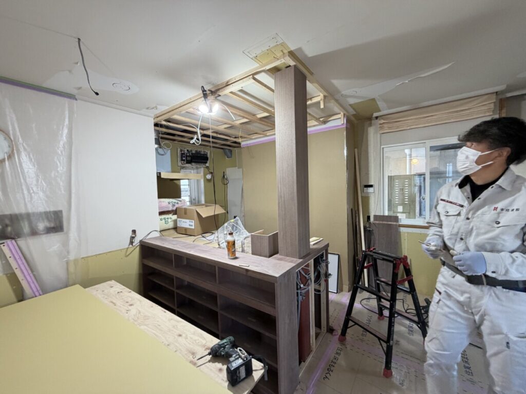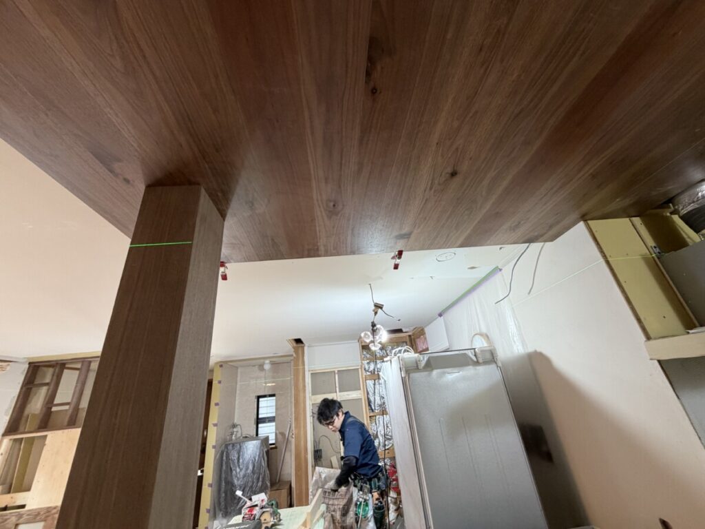 現場では、キッチンの天井廻りが進み、加工場では製作家具の