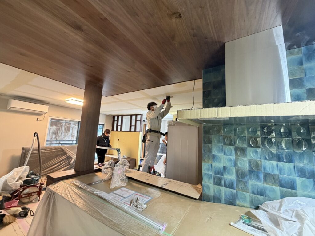 天井を二人がかりで、仕上げて行きます。