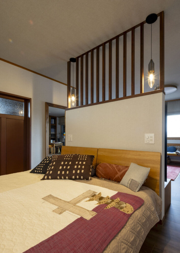 製作の格子で間仕切りをしたベッドコーナー・・・