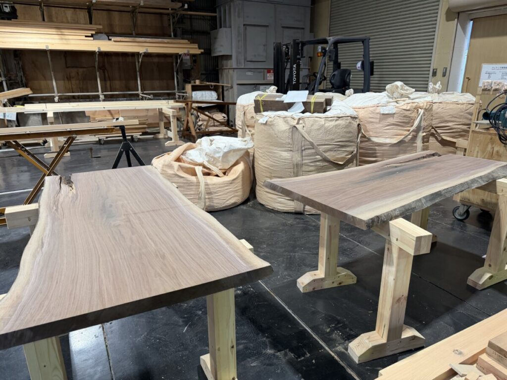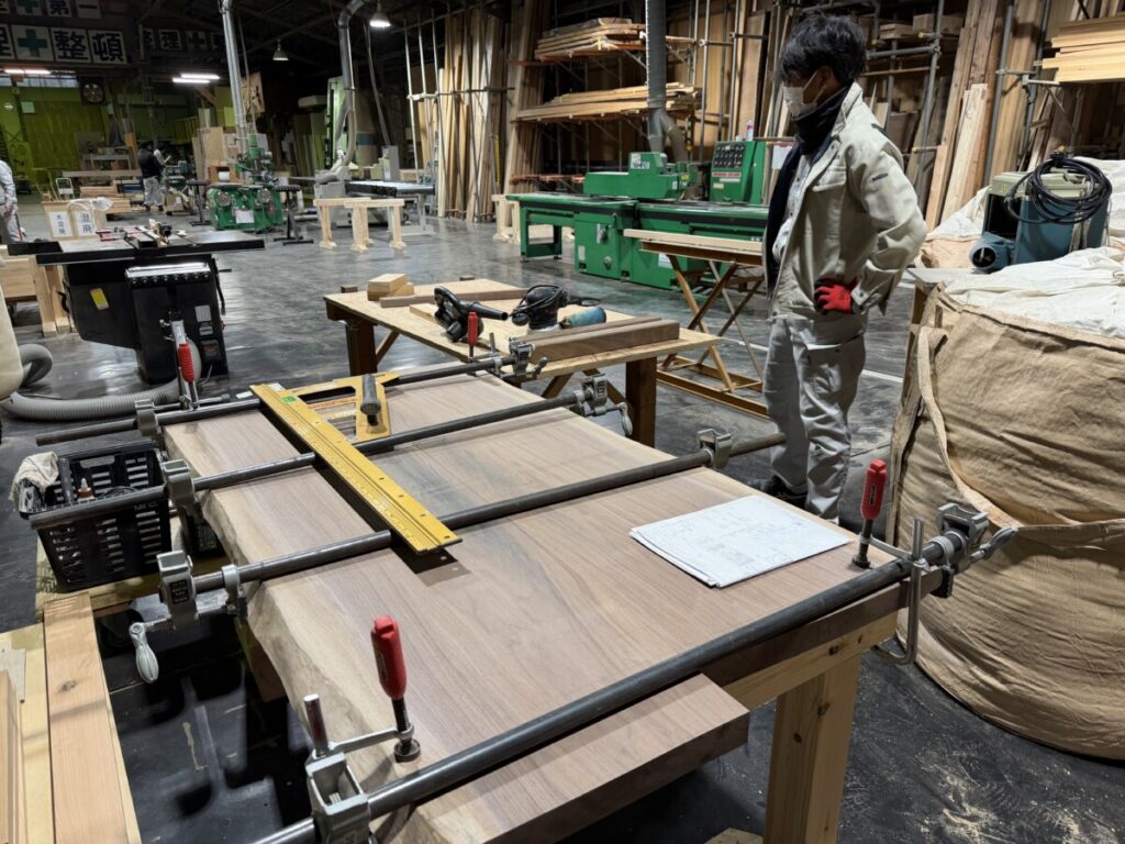 加工場では、山崎君が最後の製作家具を作成しています。