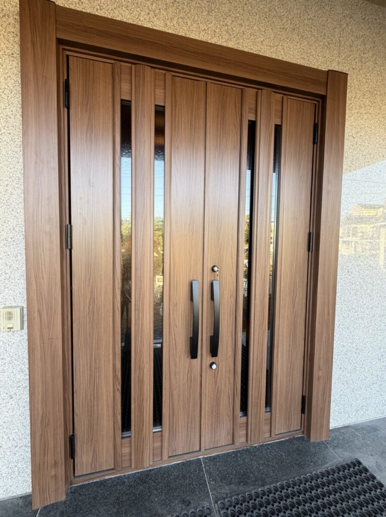 今日は、大きな欄間付きの両開きの木製玄関ドアを