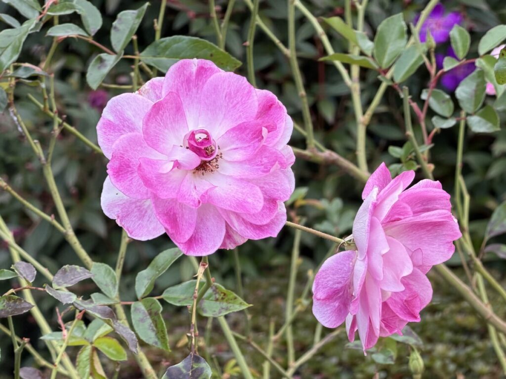 玄関前では、様々な種類のバラの花が咲いています。