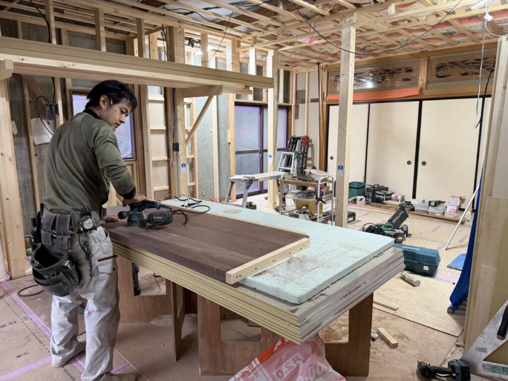 現場では、戸塚君がウォールナットの製作デスクの加工を