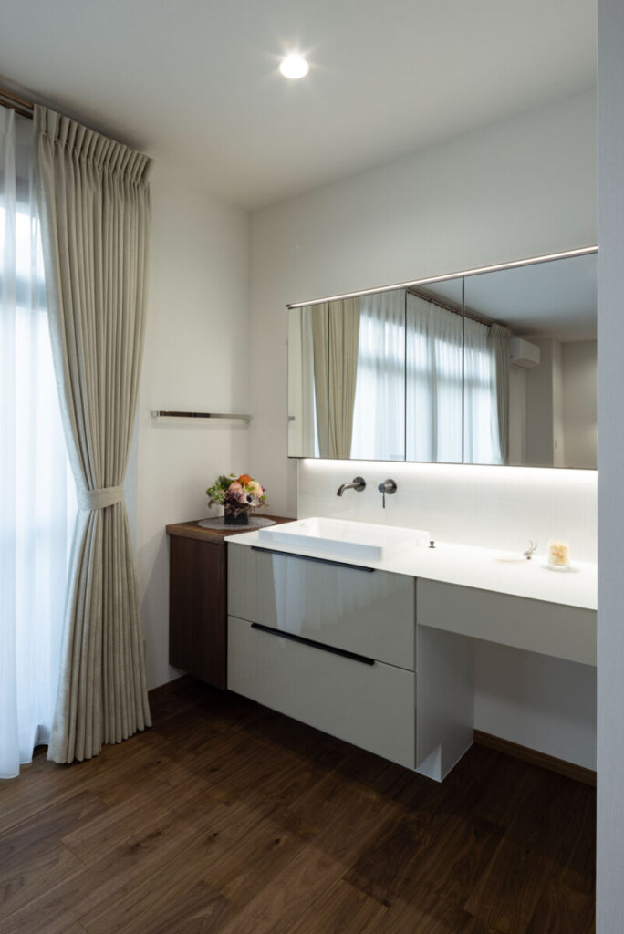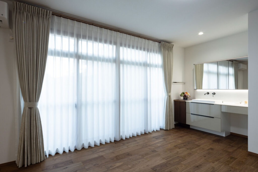 天井の高さから設置したカーテンは、スッキリとした印象に・・・
