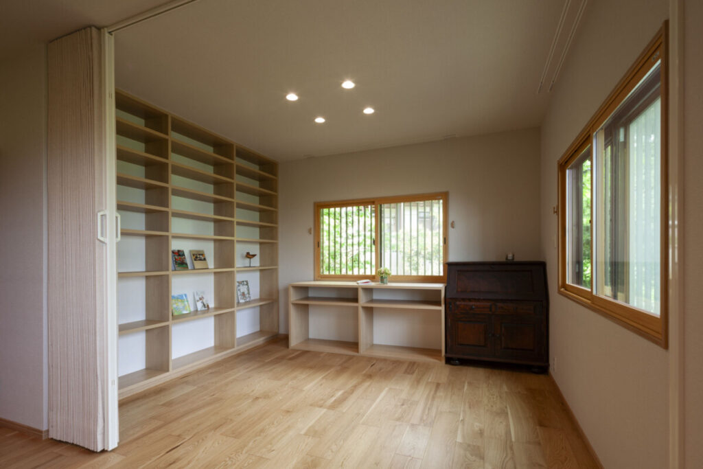 ゲストルーム兼書斎には、大きな本棚と間仕切りを設置しました。
