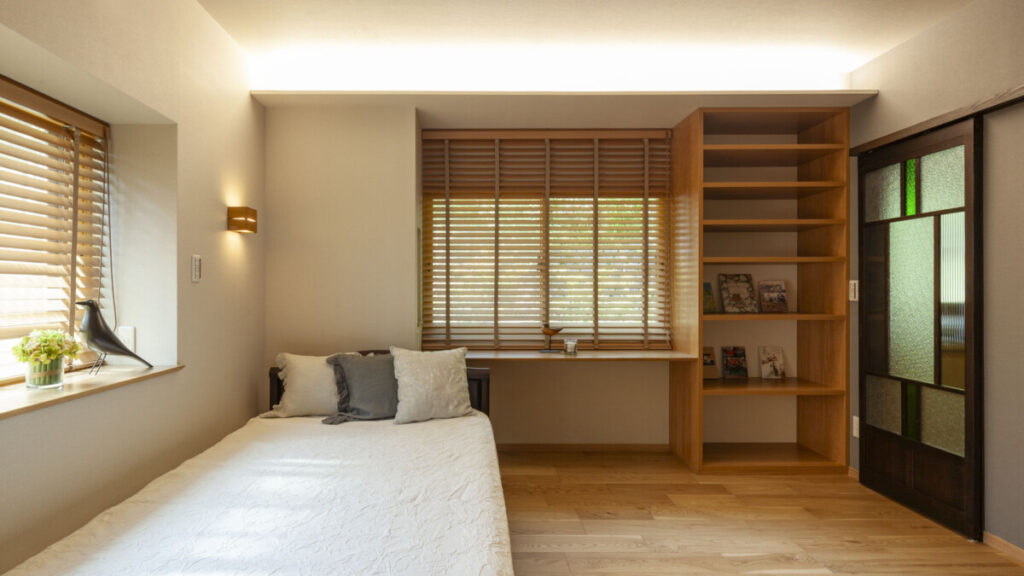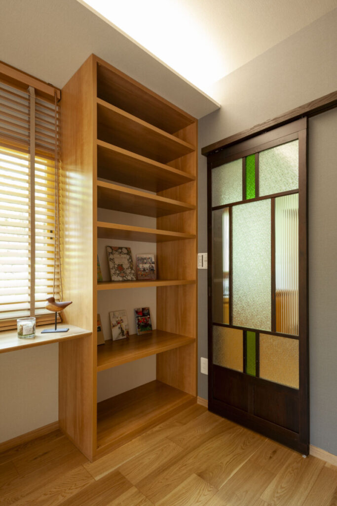 寝室には、大正時代のアンティーク引き戸に、本棚やデスクコーナー