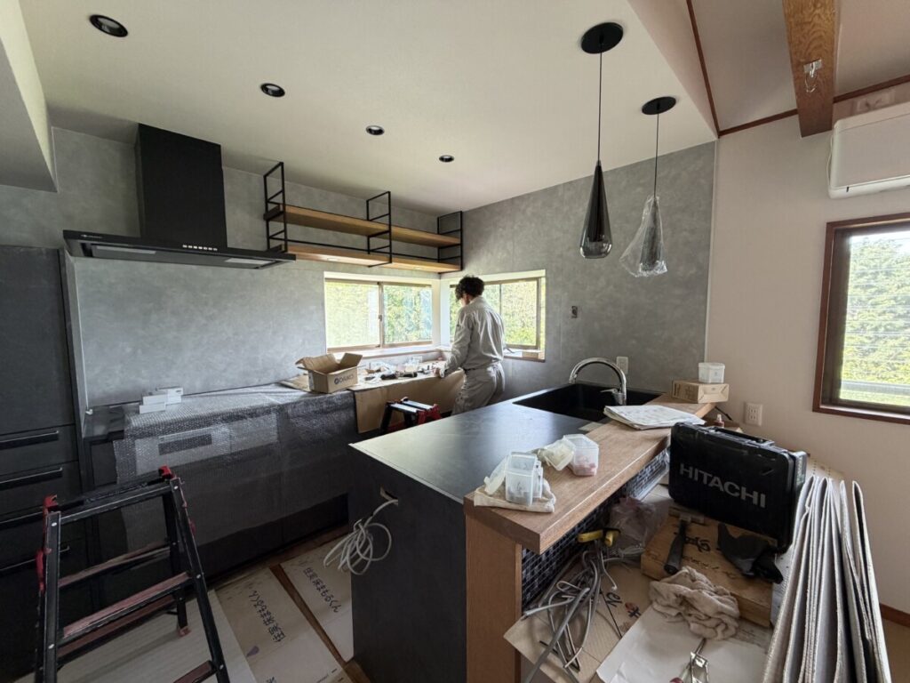 今日は、ラストスパートで木工事の完了と電気の器具付けを