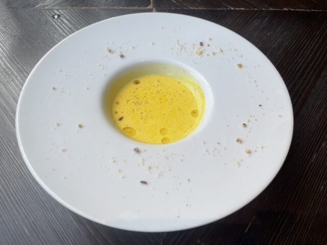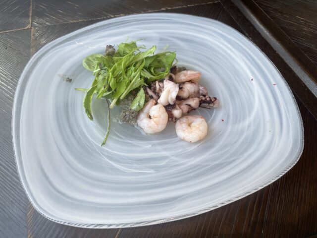魚介の前菜にとうもろこしの冷製スープ・・・