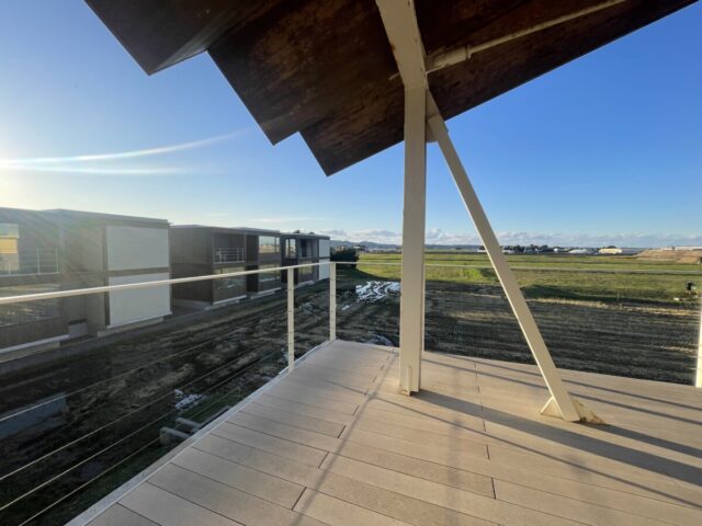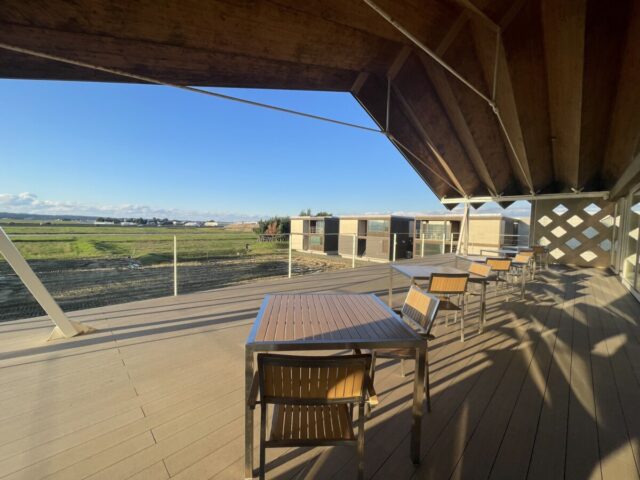 突き出したテラスからは、両側に客室棟、目の前に水田が広がります・・・