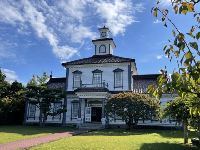 明治初期の擬洋風建築で、バルコニーと塔屋・時計台が特徴です。