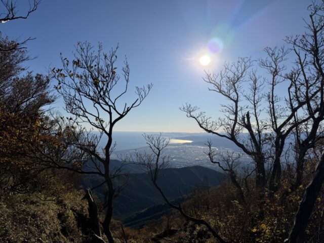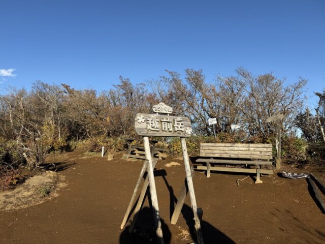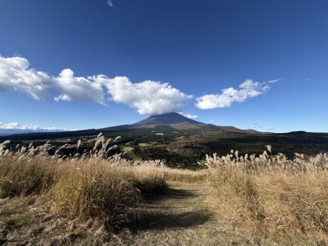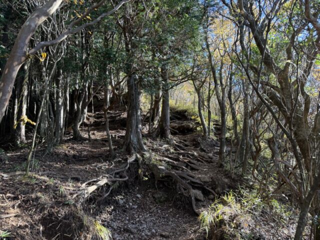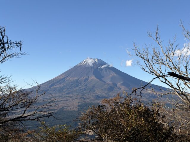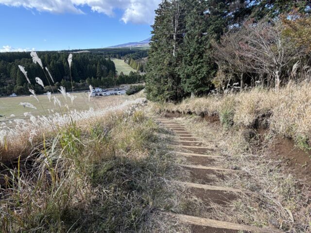 急な階段をずっと登るルートで、雲に隠れた富士山が