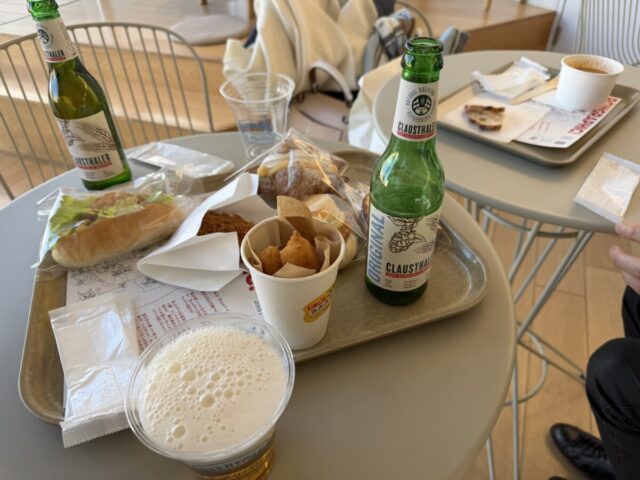 開放的な空間で、ノンアルビールと焼き立てパンの