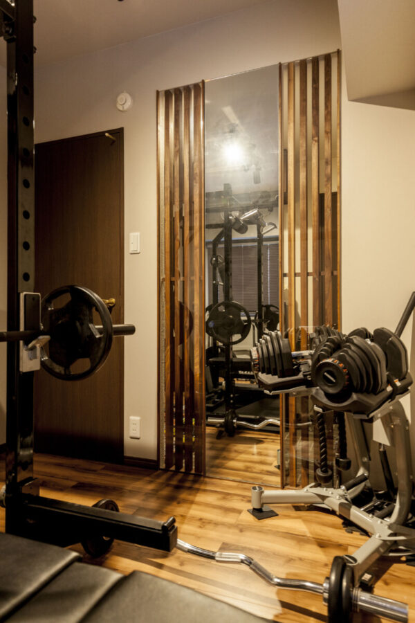 透明ガラスとウォールナットの格子から、ちら見えすると共に
