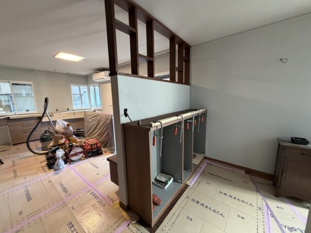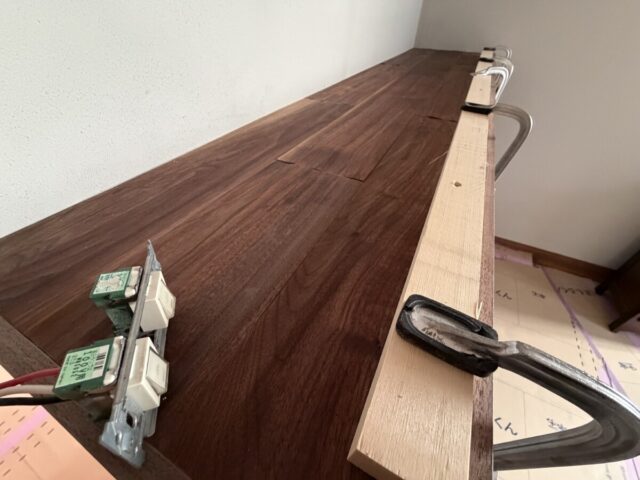 玄関のシューズクロークのカウンターは、無垢のウォールナットの