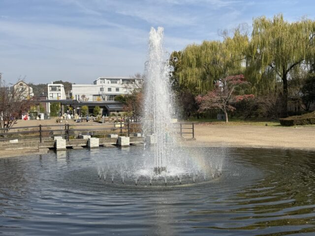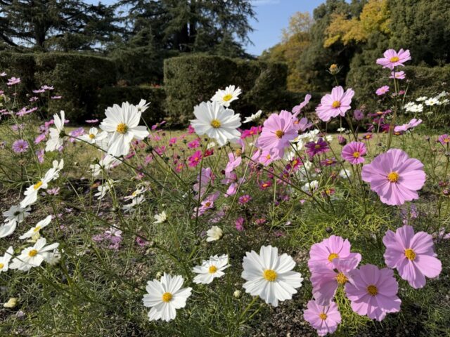 噴水の周りのコスモスと銀杏・・・