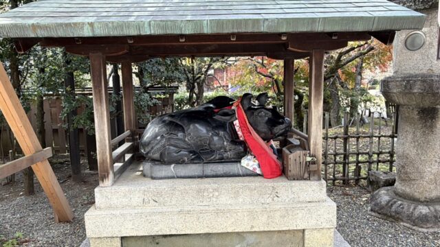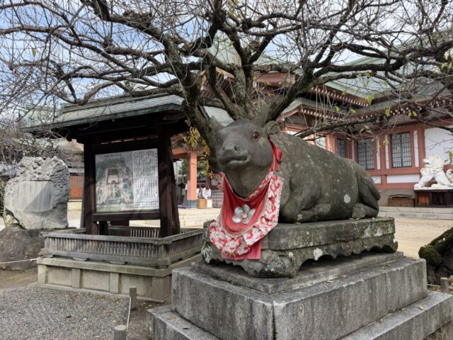 境内には、神様のお使いとして、いろいろな牛が鎮座して