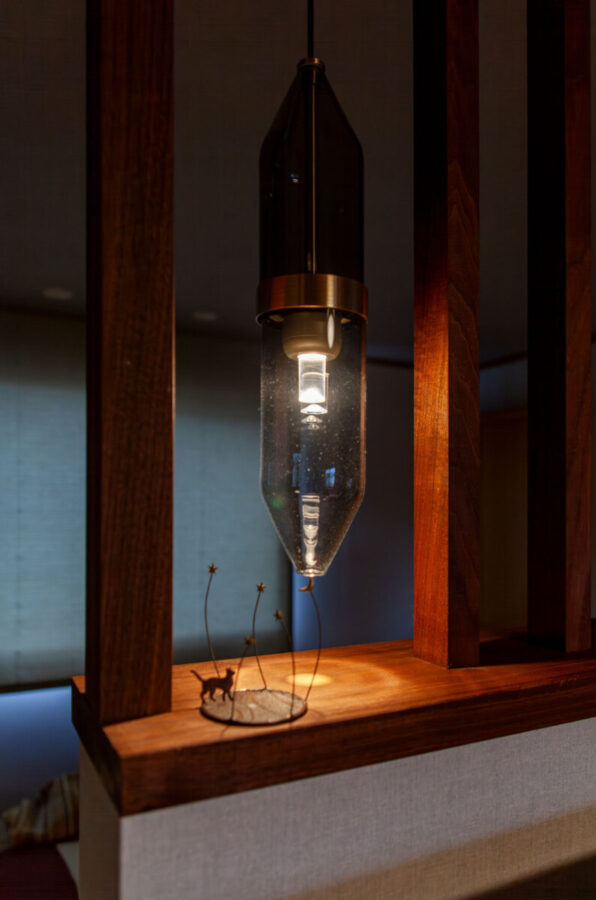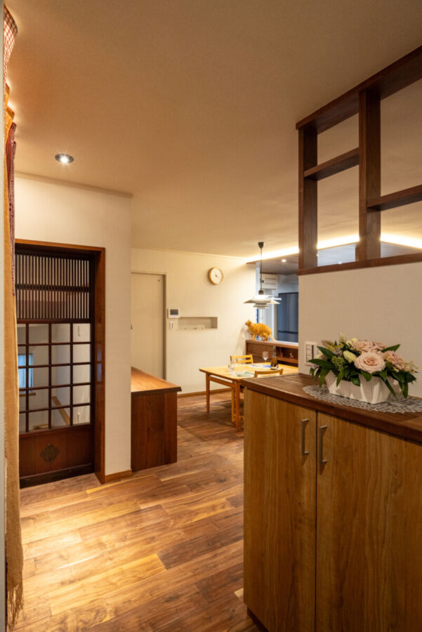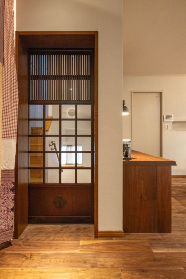 格子の向こうには、ウォールナットをハンドスクレイプ加工した