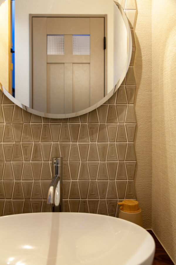 モザイクタイルにウォールナットのカウンターの手洗い。