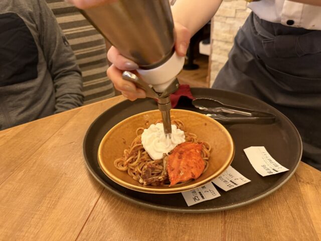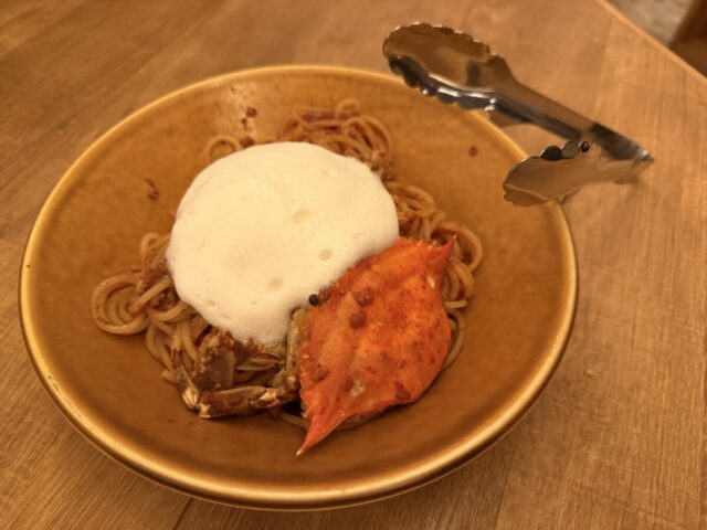 最後に目の前で仕上げてくれるワタリガニの生パスタ・・・