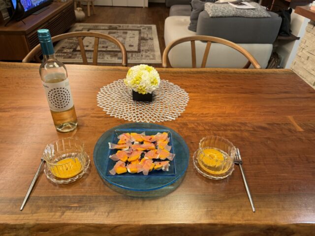 この日のおつまみは、柿と生ハムとクリームチーズとピンクペッパーです。