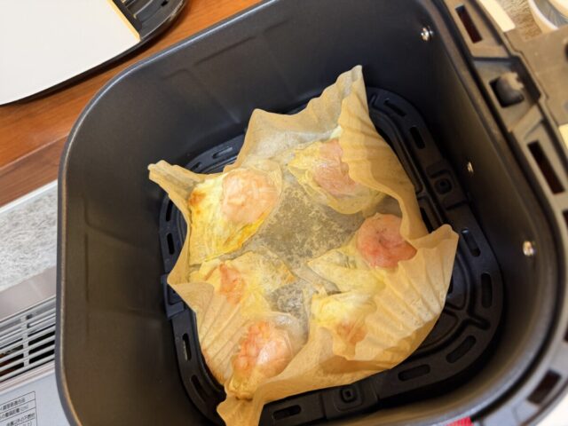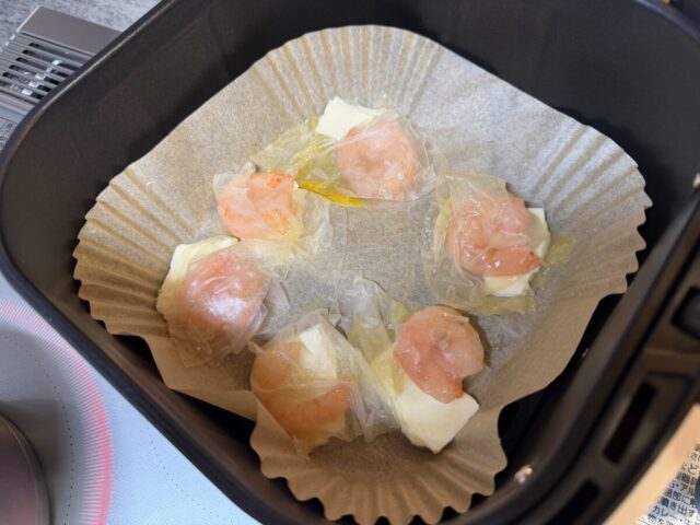 チーズと海老を挟んで、オリーブオイルをスプレーで吹きかけて・・・