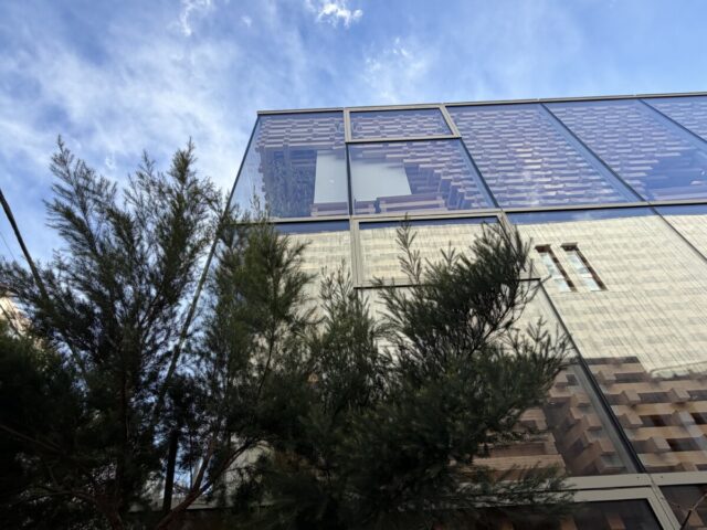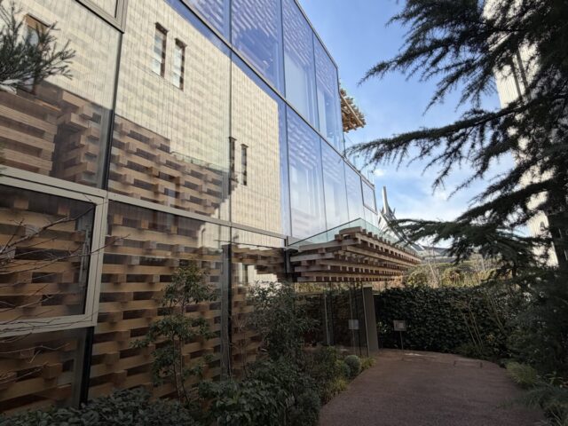 ガラス張の外観にヒノキの木組みが見えます・・・