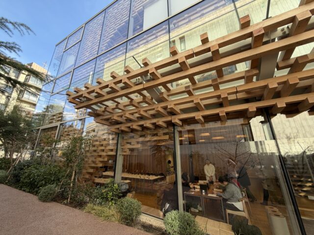 隈研吾氏設計で国産ヒノキの木組みが特徴のある建物で