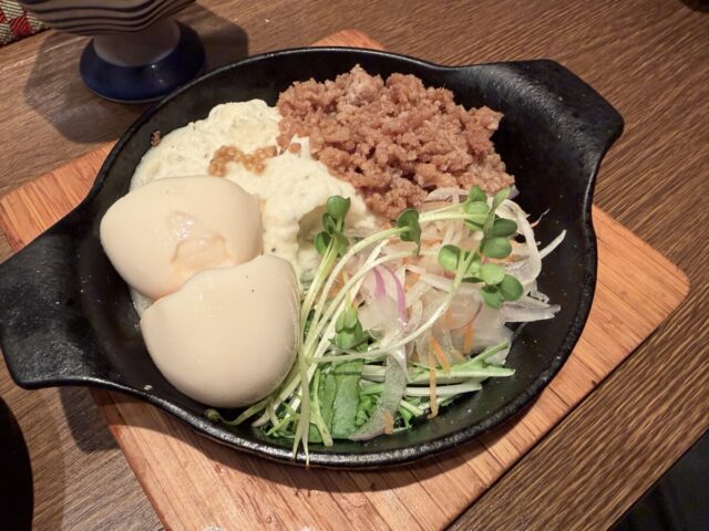 混ぜで頂く手順ですが、シャキシャキ野菜とねっとりしたポテトが